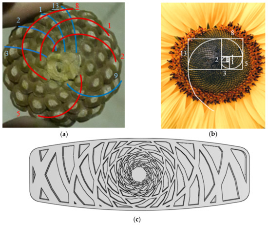 (a) A pinecone with two 8-number and 13-number opposite directional spirals; (b) Sunflower with Fibonacci spiral; (c) Pinecone-inspired structure designed using Fibonacci spirals.
