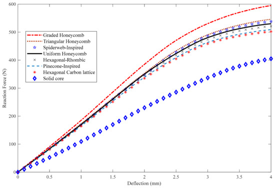 After designing different patterns, every board with the previously mentioned core structures was applied to a three-point bending loading using the geometrically non-linear FEM software package ABAQUS. The constant displacement of 4 mm in the z-direction was executed by means of the loading nose, and the reaction forces for each designed board was determined. Figure 21 compares reaction force–displacement curves of different core structures.