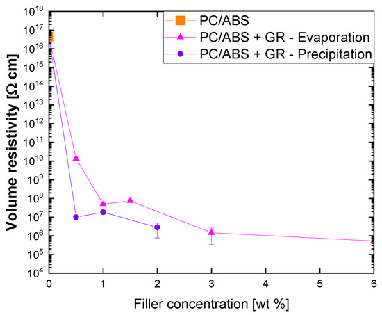 Since the common melt extrusion technique did not allow us to obtain good GR dispersion, to get electrical resistivity characterization of PC/ABS with the use of GR, the solution blending procedure was tested. The solution mixing allowed electrical percolation to be obtained with a GR content ranging from 0.5% to 1% by weight with solvent removal by precipitation and evaporation, respectively (Figure 2).