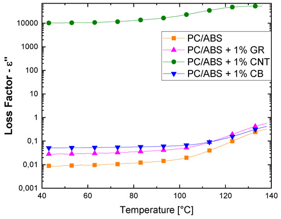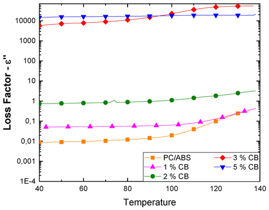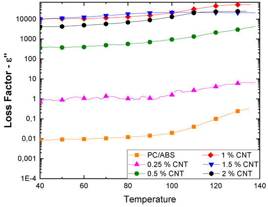As for CNTs composites, there is an increment of ε’’ with temperature; this is more significant at lower percentages of CB and the highest loss factor values were obtained above the percolation threshold, i.e., over 3 wt. %.