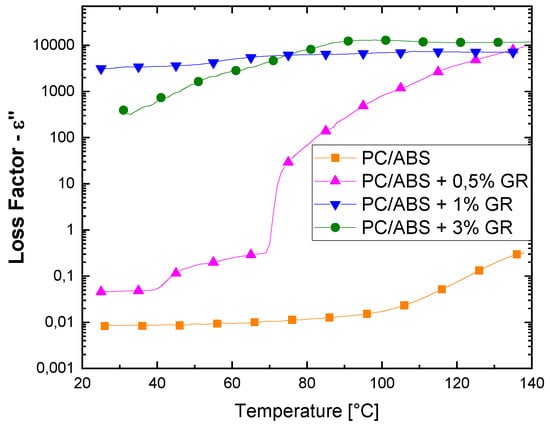 By analyzing the samples obtained by solvent dispersion of GR and the solvent evaporation removal method (Figure 6) it is possible to see that the loss factor is higher for composites with a filler concentration over the percolation threshold (that is, 1 and 3 wt. %). The sample with 0.5 wt. % has an anomalous curve in which the temperature effect is evident. Increases, in temperature result in high loss factor values, even when the percentage of GR is just below the percolation threshold. This is probably due to the fact that at high temperatures there is a higher dipole mobility, i.e., because this percentage is very close to the percolation limit, there is an insulating–conducting transition thanks to the high mobility of the polymer chains, which favors the formation of a conductive network.