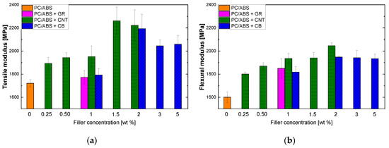 Elastic moduli of composites obtained by melt blending at different concentrations of filler: (a) tensile modulus; (b) flexural modulus.