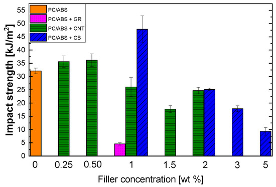 Comparing the results for the impact strength, it is clear that graphene induces fragility in the corresponding composite and a remarkable decrease in the impact strength. This behavior may be ascribed to the poor dispersion of GR and weak interfacial adhesion with the matrix, which results in the absence of a mechanical interlocking effect and introduces defects into the polymer matrix that have a negative effect on the bulk mechanical properties. For the other fillers, the general effect is a slight to moderate increase in the impact strength at low levels of loading, which disappear when the content is higher than 0.5–1 wt. %, and eventually the impact strength decreases. Significant increases in fracture toughness have been reported when 1D nanoparticles [33], such as CNTs, are used as reinforcement for matrix-dominated composites. This increase is linked to the extraordinarily high interface area of 1D nanoparticles and the bridging mechanism that suppresses the propagation of cracks and positively contributes to increased fracture toughness. This is very different for 3D fillers, such as the CB employed in this work. Crack pinning, crack deflection, and plastic void growth are cited by Saghafi et al. [33] as the key mechanisms leading to the increase in fracture toughness for 3D composites. These issues are caused by the obstruction of crack propagation by agglomerated carbon particles. It can be noted that the decrease in impact strength for CB and CNTs is reached at the electrical percolation threshold concentration. Such conditions lead to structural changes in the composite due to the formation of a three-dimensional network. With the addition of more filler, agglomerates of CNTs or CB start to form in the PC/ABS matrix, which leads to the introduction of defects that are responsible for the decrease of the impact strength [34]. Another possible explanation is related to the findings of Ganß et al. [35] for polypropylene composites. They ascribe the decline in impact performance to the increase in filler network density and the consequent minor matrix deformability, which causes stress intensification around the CNTs network. Thus, the strain localization ultimately causes matrix cracking due to severe modulus mismatch between the polymer and filler.