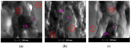 TEM micrographs of a sample with 1 wt. % of GR obtained by the melt extrusion method. Different locations of GR sheets on the PC/ABS blend domains: (a) GR located on the surface between PC and ABS domains; (b) GR located on PC moiety; and (c) GR located on ABS moiety.