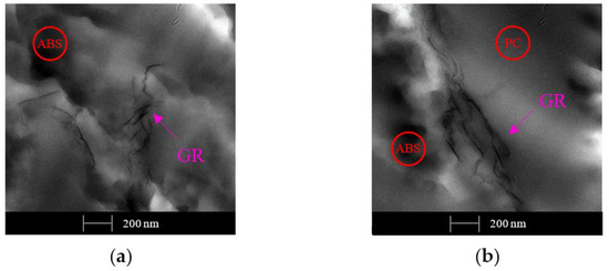In Figure 11a, GR sheets are located on the surface between the two polymer domains, while Figure 11b,c show that the GR is inside the PC and ABS, respectively. So, we can assert that GR dispersion by melt extrusion does not have a preferential distribution. However, 1 wt. % of GR does not show the formation of a continuous network, justifying the previous bad conductivity results.