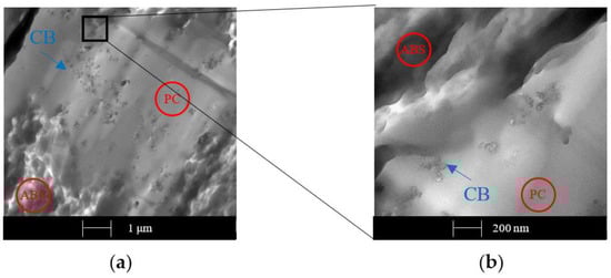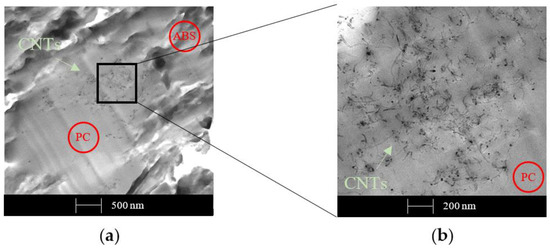As already asserted in our previous study and by Monemian et al. [36,37], Figure 13a clearly shows that CNTs are placed preferentially in the PC smooth phase; in contrast, the ABS phase seems to be free of particles. The zoomed image (Figure 13b) shows excellent CNTs dispersion within the PC portion. The preferential localization of a filler in one of the two phases is usually explained by the differences in the interfacial energies between the filler and the polymers, which is caused by the different polarities and surface energies.