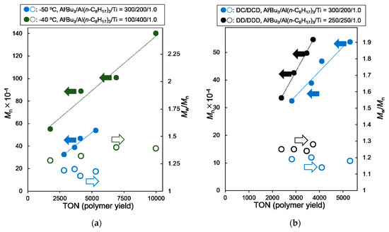 Plots of Mn, Mw/Mn vs polymer yields (turnover numbers, TON) in copolymerization of (a) 1-decene (DC) with 1,9-decadiene (DCD) and (b) 1-dodecene (DD) with 1,11-dodecadiene (DDD), using Cp*TiMe2(O-2,6-iPr2C6H3) (1)–[Ph3C][B(C6F5)4] (borate) catalyst. (b) The results in DC/DCD copolymerization at −50 °C were plotted for comparison. Detailed data are shown in Table 1 and Table 2.