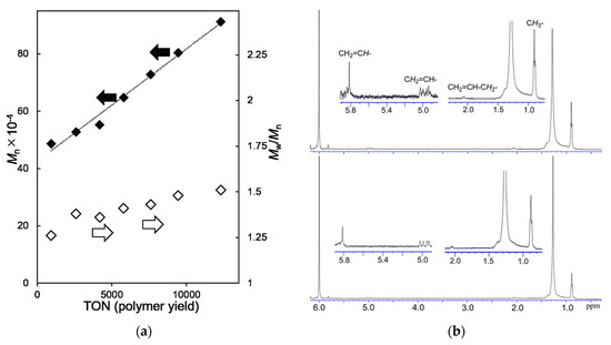 (a) Plots of Mn, Mw/Mn vs. polymer yields (turnover numbers, TON) in copolymerization of 1-tetradecene (TD) with 1,13-tetradecadiene (TDD), using Cp*TiMe2(O-2,6-iPr2C6H3) (1)–borate catalyst. (b) Selected 1H NMR spectra (in 1,1,2,2-tetrachloroethane-d2 at 25 °C) for (top) poly(DC-co-DCD) (after five min) and (bottom) poly(TD-co-TDD) (after 60 min). The resonance at 5.8 ppm would be overlapped with the satellite of the resonance at 6.0 ppm.