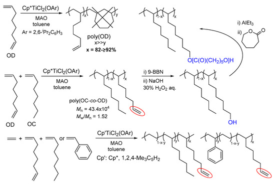 We reported that Cp*TiCl2(O-2,6-iPr2C6H3)–MAO catalyst afforded high molecular weight poly(α-olefin)s by polymerizations of 1-decene (DC), 1-dodecene (DD), 1-hexadecene, and 1-octadecene [21]. It was then revealed that polymerizations of DC, DD, and 1-tetradecene (TD) proceeded in a quasi-living manner in the presence of Cp*TiMe2(O-2,6-iPr2C6H3) (1)–[Ph3C][B(C6F5)4] (borate) catalyst and Al cocatalysts at −30 to −50 °C, affording UHMW polymers (e.g., poly(DC): Mn = 7.04 × 105, Mw/Mn = 1.37; poly(TD): Mn = 1.02 × 106, Mw/Mn = 1.38); the polymerizations proceeded with rather high catalytic activities (activity at −30 °C: 4120–5860 kg-poly(DC)/mol-Ti·h) [22]. The PDI (Mw/Mn) values decreased (accompanied with decrease in the catalytic activity) with an increase in the Al(n-C8H17)3/AliBu3 molar ratio and/or by decreasing the polymerization temperature (−40 and −50 °C). Moreover, it was demonstrated that 1,7-octadiene (OD) polymerization by Cp*TiCl2(O-2,6-iPr2C6H3)–MAO catalyst afforded polymers containing terminal olefinic double bonds in the side chain without cyclization, cross-linking (Scheme 1). An introduction of polar functionality and the subsequent grafting (by living ring opening polymerization of ε-caprolactone) was also demonstrated into poly(1-octene-co-OD)s under mild conditions [38]. The method introduced a possibility for synthesis of functionalized polyolefins by incorporation of reactive functionalities, as demonstrated in the ethylene/1-octene or ethylene/styrene copolymerization in the presence of OD (synthesis of copolymers containing terminal olefinic double bonds with uniform compositions), and subsequent chemical modification under mild conditions (Scheme 1) [39,40,41,42,43,44,45].