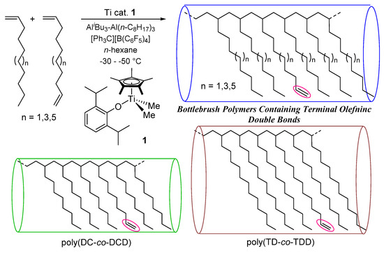 Since, as described above, UHMW polymers are simple bottlebrush polymers prepared by polymerization of these higher α-olefins via the grafting-through approach, we thus have an interest in synthesis of the UHMW polymers containing terminal olefinic double bond by copolymerization of DC with 1,9-decadiene (DCD), DD with 1,11-dodecadiene (DDD), and TD with 1,13-tetradecadiene (TDD), using 1–borate catalyst [46]. We thus, herein, wish to introduce our explored results for synthesis of new bottlebrush polymers with low PDIs containing reactive functionality in the side chain by 1–borate catalyst in the presence of Al cocatalyst (Scheme 2).
