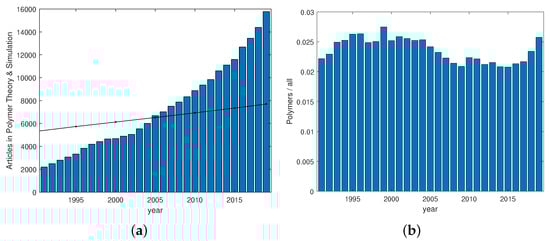 (a) Number of peer-reviewed journal articles in the field of polymer theory and simulation within the time range 1991–2019. The black reference line is the population of humans in milliards. (b) Fraction of polymer-related articles in the field of theory and simulation. Data from Web of Science (Clarivate Analytics). Approximately 2.5% of all theory and simulation articles are from within the field of polymers.