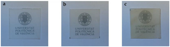 Visual appearance of the bio-based high-density polyethylene (bio-HDPE) films containing different amounts of gallic acid (GA): (a) Bio-HDPE; (b) Bio-HDPE + 0.3GA; (c) Bio-HDPE + 0.8GA.