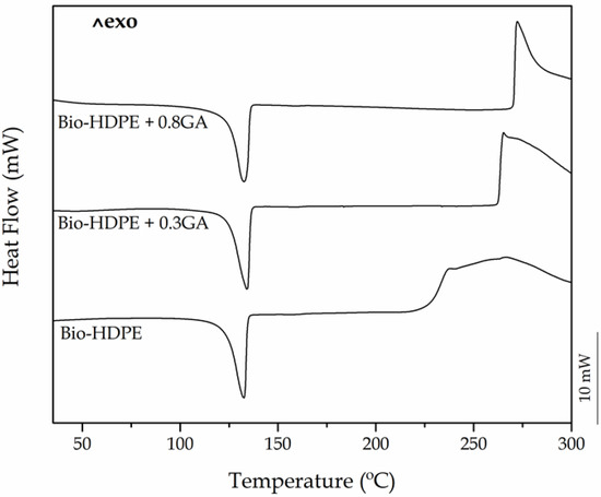 More interestingly, the DSC plots also revealed the significant oxidative retardant effect of GA on bio-HDPE. It can be observed that the onset of thermal degradation (Tonset), also called OOT when the DSC run is carried out in an oxygen-rich environment, started at 226.3 °C in the neat bio-HDPE film. This value is relatively similar to that reported by Jorda-Vilaplana et al. [47], who showed that bio-HDPE started thermal degradation at approximately 232.5 °C. The value of Tonset then increased by 36.5 °C and nearly 44 °C in the bio-HDPE films containing 0.3 phr and 0.8 phr of GA, respectively. Similar results were obtained by Samper et al. [17] where 0.5 wt % silibinin and quercetin acted as oxidative retardants for PP as both natural additives successfully delayed the onset of thermal oxidation. In this sense, Dopico-Garcia et al. [48] showed that the use of natural antioxidants could successfully result in polyolefins with enhanced stabilization against thermal-oxidation degradation. The criteria for the antioxidant activity is based on the o-dihydroxy structure of their B-ring, which confers higher stability to the radical form and participates in electron delocalization for effective radical scavenging.