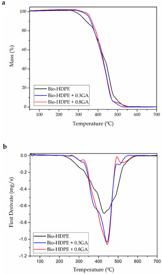 (a) Thermogravimetric analysis (TGA) curves and (b) first derivative (DTG) of the bio-based high-density polyethylene (bio-HDPE) films containing different amounts of gallic acid (GA).