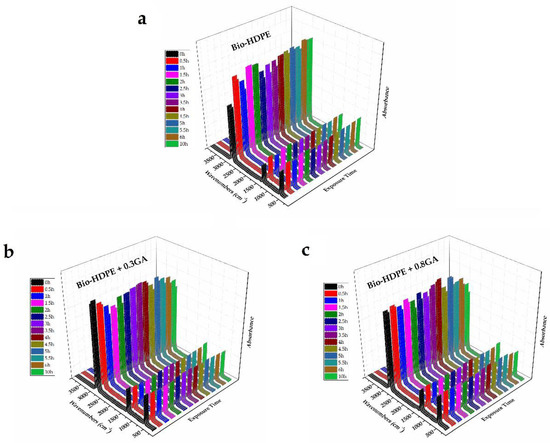Fourier transform infrared (FTIR) spectra taken across the exposure time to ultraviolet (UV) light of the bio-based high-density polyethylene (bio-HDPE) films containing different amounts of gallic acid (GA): (a) Bio-HDPE; (b) Bio-HDPE + 0.3GA; (c) Bio-HDPE + 0.8GA.