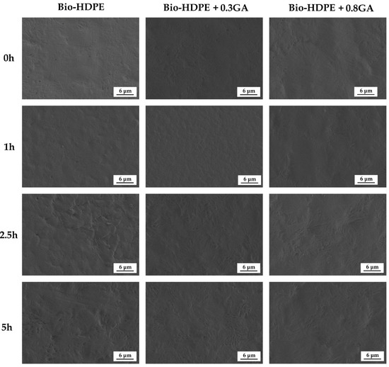 Finally, Figure 7 shows the FESEM images of the bio-HDPE films exposed to 5 h UV light. One can observe that, prior to UV light exposure, all of the films presented a similar fracture surface without any cracks or wrinkles. After 1 h of UV light exposure, the films developed an increase in roughness on their fracture surfaces. However, the GA-containing films generated a smoother surface, which is representative for a slower or negligible UV light aging. One can also observe that the fracture surface of the neat bio-HDPE suffered a remarkable modification after 2.5 h of UV light exposure. Indeed, the life time of an article made of HDPE without stabilizers can be as low as one year since the polyolefin decomposes rapidly by UV light action [73]. This phenomenon is related to the presence of impurities that are formed during their synthesis such as carbonyl, peroxide, hydroxyl, hydroxyperoxide, or any substances with unsaturated groups, which absorb light at higher wavelengths and thus yield the generation of free radicals. The incorporation of 0.3 phr GA significantly reduced the UV degradation of bio-HDPE and the fracture surfaces remained similar for up to 2.5 h, time at which some wrinkles were formed. Furthermore, 0.8 phr GA successfully kept the film samples stable up to 5 h of UV light exposure, showing fracture surfaces free of cracks. Therefore, the morphological analysis correlates well with the FTIR spectroscopy results shown above and confirmed the UV light stability provided by GA to the bio-HDPE films that can thus improve the shelf life of the green polyolefin. The antioxidant effect of GA is considered to also protect the free residues that are generated during polymer synthesis with improved degradation stability [74]. Indeed, UV stabilizers have always been categorized as a subgroup within the antioxidant additive group. Similarly, Du et al. [75] showed that HDPE/wood flour composites containing pigments presented fewer cracks on the surface than composites without pigment after accelerated UV weathering. The authors suggested that pigments can mask some UV radiation and prevent HDPE against UV radiation damage. Similar results were previously reported by Samper et al. [17] through the use of quercetin and silibinin as UV light stabilizers for PP.