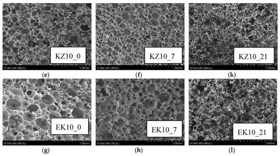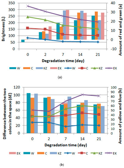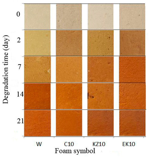 Foam color test results were presented in Figure 2a,b. The test results showed a decrease in the brightness of the foams with increasing time of degradation (from 7 to 21 days) in all foams (W, C, KZ, EK), e.g., brightness L was from 86.214 for KZ10_0 foam to 51.432 for KZ10_21. It meant that the samples darken—Figure 2a. An increase of conditioned time also increased the content of red and green (a) and yellow and blue (b) colors. W_0 foam had the largest ∆E parameter (87.461), while the KZ10_21 foam had the lowest (58.951). The value of ∆E decreased with the longer degradation time from 87.461 for W_0 foam to 62.757 for W_21 foam, to 64.231 for C10_21 foam, to 58.951 for KZ10_21 foam, and to 66.930 for EK10_21 foam—Figure 2b.