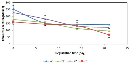where: W0—compressive strength measured before foam degradation (kPa), Wx—compressive strength measured after foam degradation (kPa): x = 7 or 14 or 21.