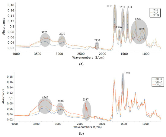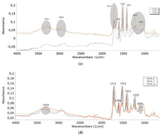 An increase in absorbance of some bond bands was observed regardless of the type of foam (W, C, KZ, EK), which indicated structural changes taking place in the foams. The bands increased their intensity with the increased degradation time in the air conditioner chamber. Intensity of wavenumbers increased for the remaining bands (3325, 1713, 1596, 1512, 1411, 1225, 1076 cm−1) for W series of foams—Figure 4a. An increase in band intensity was observed in the case of foams with cinnamon extract (C series) at wavenumbers of 2930, 2387, and 2137cm−1, and decrease in band intensity for wavenumber of 1520 cm−1—Figure 4b. The changes were slight or nonexistent for the other wavenumbers ranges of the C series. The FTIR spectra for foams with green coffee extract (Figure 4c, EKZ series) showed a decrease in the intensity of bands for all 21-day degraded foam (KZ10_21) in comparision with bands for the 7-day degraded foam (KZ10_7)—Figure 3c. The FTIR spectra for foams with cocoa extract (Figure 4d, EK series) showed an increase in the intensity of bands for wavenumbers of all degraded foam (EK10_14, EK10_14, EK10_21) in comparision with bands of nondegraded foam (EK10_0).