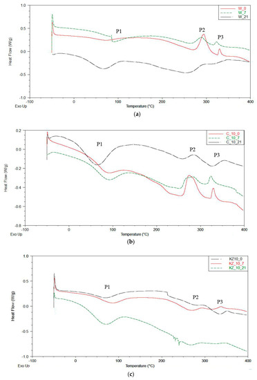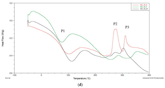 The DSC curves recorded effects, such as: The temperature of the beginning of the thermal effect (Toneset), the temperature of the end of the thermal effect (Tk), the temperature of the extreme point (Tmax), and enthalpy (H) [71,72,73]. The DSC thermograms of cinnamon, green coffe, and cocoa-filled foams (C, KZ, and EK series) had one endothermic peak P1 and two exothermic peaks P2 and P3 (Figure 5a–d).