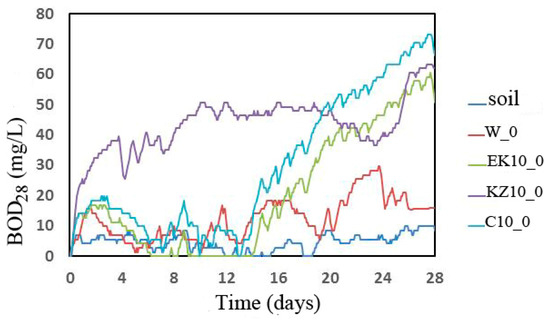 The BOD28 values of analyzed samples, necessary to determine the Dt after 28 days in the soil environment, were calculated based on the results of BOD changes of foams (Figure 7) and BOD changes of soil environment (without foams). The TOD values of the appropriate foam were calculated based on the results from Table 10 and Equation 11. The biodegradation degrees (Table 10) were calculated from Equation 10. Research showed that the KZ10_0 foam had the highest values of biochemical oxygen demand, especially up to day 19 of biodegradationc (Figure 7). However, the highest BOD values were achieved by EK10_0 and C10_0 foams after the 19th day of degradation. BOD after 28 days of research of susceptibility to biodegradation reached the highest value for C10_0 (57.7 mg/L). Theoretical calculations of oxygen demand and biodegradation showed that the largest TOD was for W_0 foam (81.27 mg/L). Cinnamon modified foam was characterized by the biggest biodegradation degree Dt value (78.65%). Dt was the lowest for W foam and was 8.3% and BOD was 7%.