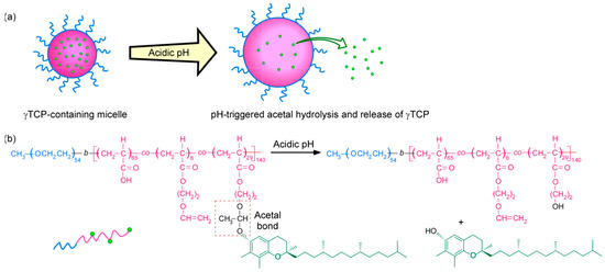 High concentrations of γ-tocopherol (γTCP) tend to show antioxidant, anti-inflammatory, and anticancer effects. In this study, we prepared polymer micelles under acidic conditions with a controlled release of γTCP due to the decomposition of pendant acetal bonds. First, a precursor diblock copolymer composed of poly(ethylene glycol) (PEG) and acrylic acid (AA) was prepared. This was followed by the synthesis of an amphiphilic diblock copolymer (PEG54-P(AA/VE6/γTCP29)140), incorporated into hydrophobic γTCP pendant groups attached to the main chain through an acetal bond. The prepared PEG54-P(AA/VE6/γTCP29)140 was further dispersed in water to form polymer micelles composed of hydrophobic cores that were generated from a hydrophobic block containing γTCPs and hydrophilic shells on the surface. Under acidic conditions, γTCP was then released from the core of the polymer micelles due to the decomposition of the pendant acetal bonds. In addition, polymer micelles swelled under acidic conditions due to hydration of the core.