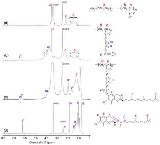 Poly(ethylene glycol) methylether (4-cyano-4-pentanoate dodecyltrithiocarbonate) (PEG54, Mn = 2.40 × 103 g/mol) and γ-tocopherol (γTCP, 96%) were purchased from Sigma Aldrich (St. Louis, MO, USA); 1-ethyl-3-(3-dimethylaminopropyl)carbodiimide hydrochloride (EDC, 98%) and N,N-dimethyl-4-aminopyridine (DMAP, 99%) were procured from Fujifilm Wako Pure Chemicals (Osaka, Japan). Ethylene glycol mono-vinyl ether (EGVE, 98%) and p-toluenesulfonic acid (p-TSA, 98%) were supplied by Tokyo Chemical Industry (Tokyo, Japan). All reagents above were used as received without further purification. We used 2,2′-azobisisobutyronitrile (AIBN, 98%) from Sigma Aldrich (St. Louis, MO, USA) after recrystallization using methanol. Acrylic acid (AA, 98%), 1,4-dioxane (99%), and N,N-dimethylformamide (DMF, 99%) from Fujifilm Wako Pure Chemicals (Osaka, Japan) were used after vacuum distillation. Water was purified with an ion-exchange column system. Other reagents were used as received.