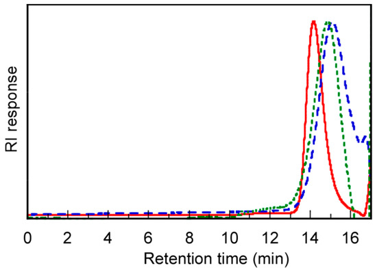 Gel-permeation chromatography (GPC) elution curves of PEG54-PAA140 (―), PEG54-P(AA/VE35)140 (– –), and PEG54-P(AA/VE6/γTCP29)140 (----) at 40 °C using a phosphate buffer solution (PBS) at pH 9 containing 10% v/v acetonitrile as the eluent.