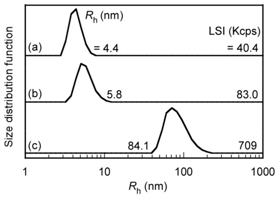 The Rh and LSI of the polymers were measured at Cp = 0.10 g/L in a PBS buffer of pH 7.4 at 25 °C to confirm aggregation-state changes for PEG54-PAA140, PEG54-P(AA/VE35)140, and PEG54-P(AA/VE6/γTCP29)140 (Figure 5). The Rh values of PEG54-PAA140 and PEG54-P(AA/VE35)140 were 4.4 and 5.8 nm, respectively. The LSI values of PEG54-PAA140 and PEG54-P(AA/VE35)140 were estimated as 40.4 and 83.0 Kcps, respectively. These polymers may dissolve in PBS to form unimers due to their small Rh and LSI values. On the other hand, the Rh and LSI of PEG54-P(AA/VE6/γTCP29)140 increased to 84.1 nm and 709 Kcps, suggesting the formation of polymer micelles. These polymer micelles were formed due to the hydrophobic interaction between pendant γTCP groups, which were composed of a hydrophobic P(AA/VE6/γTCP29)140 core and hydrophilic PEG54 shells. The end-to-end distance of the PEG54-P(AA/VE6/γTCP29)140 polymer chain was estimated as 53.4 nm, assuming that the lengths of the vinyl monomer unit and the PEG chain were 0.25 and 18.4 nm, respectively [30,31,32]. The Rh value of the polymer micelle was calculated as 84.1 nm, which was larger than the end-to-end distance of PEG54-P(AA/VE6/γTCP29)140 (=53.4 nm). Therefore, polymers could not form simple spherical core–shell structures. The polymers may form intermicellar aggregates or large compound micelles.