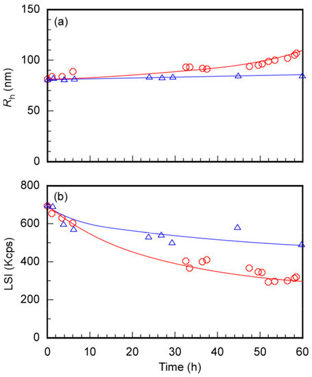 To evaluate the time dependence on micelle size and density formed from PEG54-P(AA/VE6/γTCP29)140 in acetate buffer of pH 5.2 (0.01 M), Rh and LSI changes were monitored at 25 °C (Figure 7). At constant particle size, density depended on the LSI. As a reference experiment, the time dependence on Rh and LSI of the polymer micelles in a PBS buffer of pH 7.4 (0.01 M) were also monitored. Rh increased with increasing time at pH 5.2. Rh values just after preparation and after 60 h at pH 5.2 were determined as 81.0 and 107.0 nm, respectively. LSI values of just after preparation and after 60 h at pH 5.2 were estimated as 693 and 321 Kcps, respectively. The LSI were observed to decrease with increasing time. At pH 5.2, the pendant acetal bonds decomposed to release the hydrophobic γTCP from the polymer micelles. As a result, hydroxyl groups were generated at the pendant groups. However, not all pendant acetal bonds were decomposed at pH 5.2. However, an increase in Rh and decrease of the LSI was due to decreasing densities observed at pH 5.2, attributed to the hydration and then swelling of the core of the polymer micelles. Oho et al. [36] reported that γTCP is relatively stable against acidic conditions. The released γTCP from the polymer in a buffer at pH = 5.2 may not be decomposed.