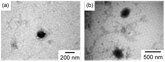 Transmission electron microscopy (TEM) images of PEG54-P(AA/VE6/γTCP29)140 at Cp = 0.10 g/L in acetate buffer of pH 5.2 (a) just after preparation and after (b) 60 h.