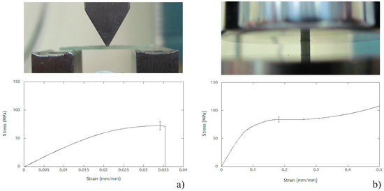 Mechanical testing setup and typical stress strain behaviour in: (a) Three point bending; (b) compression.