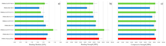 Mechanical properties of PMMA, PMMA/BG and PMMA/CuTCP composites. (a) Bending modulus; (b) bending strength; (c) compression strength.