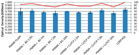 P. aeruginosa, S. aureus, and E. coli were used. Each bacterial strain was grown in a brain heart infusion (BHI, Sigma-Aldrich, Merck, Darmstadt, Germany) for 24 h at 37 °C by shaking at 250 rpm. For each PMMA, PMMA/BG, and PMMA/CuTCP composites, three samples were used, each kept for 72 h in BHI. Hence, 10 µL of bacterial suspensions, collected from the overnight growth, were transferred to each well, and anti-bacterial activity of each PMMA-based substrate was investigated following incubation at 37 °C for 24 h. For each PMMA-based biocomposite the test was performed in triplicate, and optical density at 600 nm through the BioPhotometer (Eppendorf AG, Hamburg, Germany) was measured.