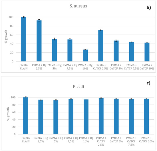 Figure 5 shows bacterial growth on PMMA, PMMA/BG, and PMMA/CuTCP composites. Results suggest that modification of bone cements with BG and CuTCP particles are effective in reducing P. aeruginosa growth (Figure 5a). In particular 2.5%w of BG or CuTCP particles already produce a significant reduction of P. aeruginosa growth (p < 0.05). However, 5%w of BG or CuTCP particles reduces by about 80% and 75% P. aeruginosa growth, respectively. Modification of bone cements with BG and CuTCP particles are effective in reducing S. aureus growth (Figure 5b). In particular, at a concentration of 5 wt% of BG or CuTCP, a significant reduction (p < 0.05) of S. aureus growth is observed. No significant inhibition of E. coli growth has been observed (Figure 5c).