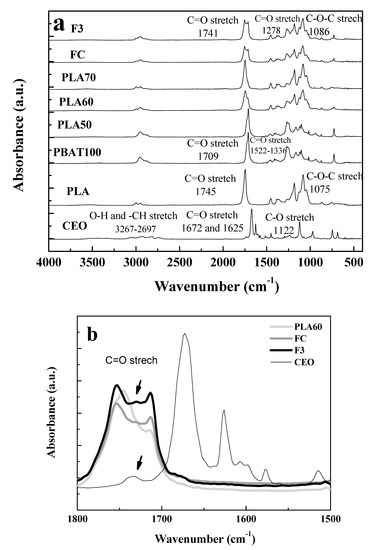 FTIR spectra of: (a) CEO, homopolymers (PLA100, PBAT100), blends (PLA50, PLA60, PLA70), and fibers (FC, F3) and (b) detail for CEO, PLA60, FC, and F3.