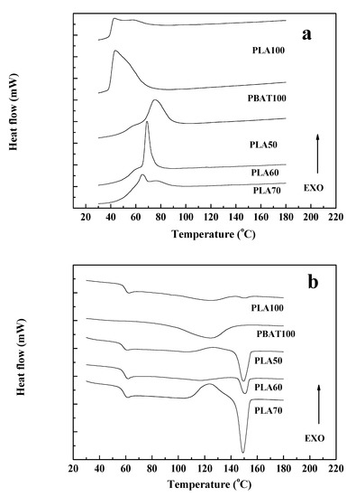 In Figure 4a, from the cooling thermograms, the crystallization temperature (Tc) of PLA100 and PBAT100 was similar (43 °C). In the literature, reported values for the Tc of PLA are 93.8 °C [56] and 100 °C [57]; and for PBAT 86.8 °C; 83.1 °C [58] and 70.7 °C [59]. As seen from the results, the Tc (43 °C) was lower for PLA and PBAT compared to the values reported in the literature. This could be due to reprocessing and possible thermal degradation of PLA during processing as mentioned before [60].