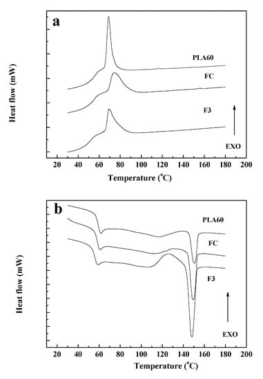 DSC thermograms for PLA60 and bio-based polymer fibers FC and F3: (a) Cooling and (b) second heating.