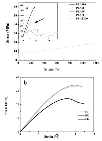 In Figure 6, a representative stress–strain curve for the homopolymers and blends is seen. In Figure 6a, a detail of the curve was added to better observe the mechanical behavior of PLA and the blends in the 0%–30% elongation region. Yield deformation can be observed (arrowed) due to plastic deformation of PBAT [85,86]. In Figure 6b, the stress–strain curve of the fibers is shown.