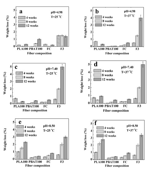 The hydrolytic degradation was followed for PLA100, PBAT100, FC, and F3 fibers. On the other hand, from the morphology it was observed that the FG fiber showed porosities and cracks; therefore, the hydrolytic degradation of this fiber was not relevant.