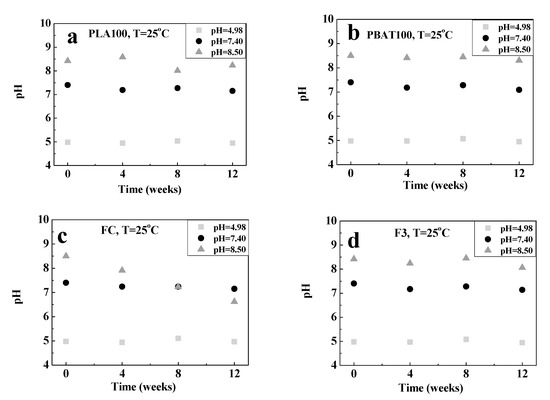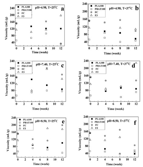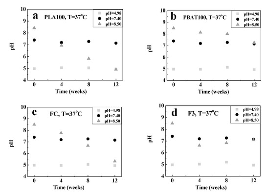 Because CHCl3 is a common solvent for the fibers obtained from both homopolymers, the variation in the molecular weight Mv for the PLA100 and PBAT100 in the blends could not be monitored. However, through the variation of the viscosity in the samples studied, it can be inferred how the experimental conditions of the hydrolytic degradation (pH and temperature) influence the process at the exposure times.