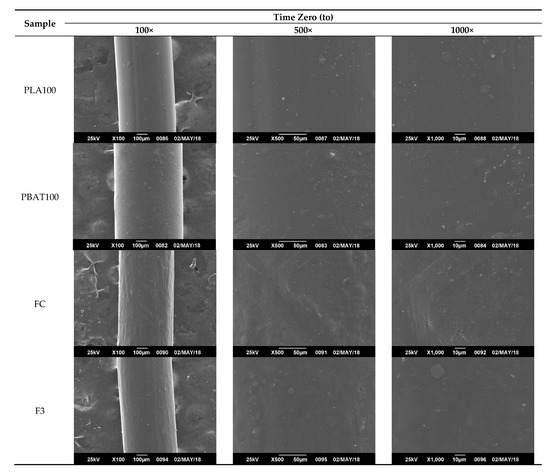 Results for tensile mechanical test can be seen in Table 6. The addition of PBAT to the blends modified the mechanical properties of PLA100. It was observed that as the percentage of PBAT in the blends increased, a lower strength (MPa) was required to reach similar percentages of elongation. However, comparing PLA50 with PBAT, PLA50 is composed of 50% PLA and 50% PBAT, its Young’s modulus value was 232.2 ± 20.0 MPa having PBAT a Young’s modulus value of 1.6 ± 0.2 MPa. From the thermal properties (Table 5), the Tg value for PBAT was −34.0 °C and for PLA50 it was 61.4 °C. When the Tg value is below room temperature, the polymer is in a rubbery state and then, the value of Young’s modulus is lower compared to a polymer, of which the Tg value is above room temperature with a fragile behavior and high modulus [75].