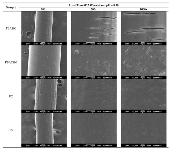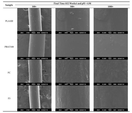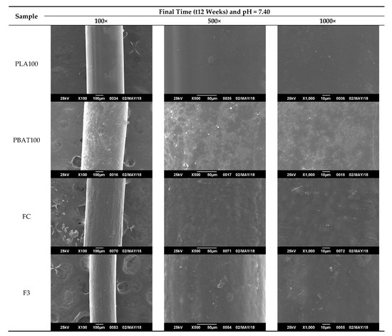 In the case of the hydrolytically degraded samples, the results of the fibers exposed to the degradative medium during a period of 12 weeks at a temperature of 25 °C were considered, because this is the test condition that is closest to the conditions of use of the fibers. On the other hand, the degradation process was also carried out at a temperature of 37 °C in order to simulate hot and humid environments in which an accelerated degradation process could occur. Therefore, the results obtained for the PLA100 fiber were considered since these fibers showed evidence of degradation under alkaline pH test conditions will be discussed later. The rest of the samples (PBAT100, FC, F3) did not present conclusive evidence of degradation at the surface level and they were not included.