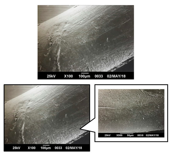 As seen in Table 6, there were no significant differences for the fibers when adding CEO (F3) to the control FC fiber. On the other hand, similar behavior was observed for Young’s modulus, tensile strength at break, and elongation at break, in which the formulations did not show significant statistical differences, except for the case of fiber with glycerol (FG) for Young’s modulus and tensile strength at break. However, the difference in the plasticizing effect between the CEO and the glycerol [82] was not significant enough to be reflected in the elongation at break. The decreased in mechanical properties for FG is evidenced in Figure 2b with the presence of microcracks and porosities observed in the fiber surface due to possible migration of the plasticizer [83,84].