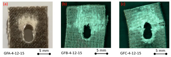Fracture images of (a) GFA-4-12-15, (b) GFB-4-12-15, and (c) GFC-4-12-15 glass-flax samples.