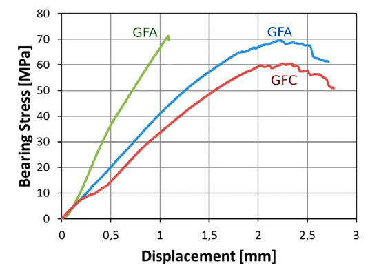 The unaged glass-flax laminate (i.e., GFA sample) evidences effective mechanical performance as confirmed by the high stress level reached before failure. Furthermore, this batch highlights a quite large linearity region for bearing stress values up to about 125 MPa. Then, bearing stress progressively increases at increasing displacement until a stabilization is reached at about 180–190 MPa. A significant stress fluctuation in the bearing stress plateau can be identified due to the compression collapse of the epoxy matrix just behind the pin/hole contact area. A maximum stress at about 200 MPa was reached beyond which the sample failure occurred.