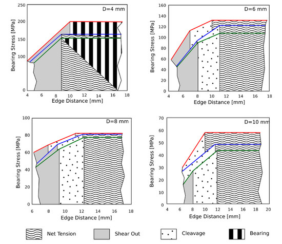 In order to better discriminate the damage mechanisms that compete at varying joint geometry, in Figure 8, different topological failure plots obtained evaluating the maximum stress at varying the geometric parameters E (edge distance) and D (hole diameter) were schemed.