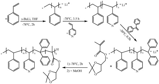 Synthetic route leading to PS-b-P4VP-b-PSMA by sequential anionic polymerization of styrene, 4-vinyl pyridine, and solketal methacrylate.
