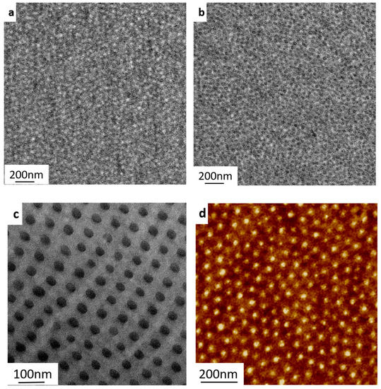 - Ludwigs, S.; Böker, A.; Voronov, A.; Rehse, N.; Magerle, R.; Krausch, G. Self-assembly of functional nanostructures from ABC triblock copolymers. Nat. Mater. 2003, 2, 744. [Google Scholar] [CrossRef]
