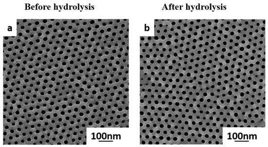 Block copolymer membranes with high porosity, homogeneous pore size, and tunable chemical properties hold tremendous potential as robust, efficient, and highly selective separation membranes. We tested the integral asymmetric PS71-b-P4VP26-b-PGMA3145 membrane for ultrafiltration and analyzed the separation performance of the hexagonally organized isoporous structure by comparing it with pristine PS71-b-P4VP26-b-PSMA3145 membrane. The permeance of the membranes before and after hydrolysis was measured in dead-end mode at 2 bar trans-membrane pressure. It is reported in the literature that improvement of hydrophilicity has an influence on the pure water flux [54]. The initial permeance of the pristine PS71-b-P4VP26-b-PSMA3145 and hydrolyzed PS71-b-P4VP26-b-PGMA3145 membrane is 390 ± 25 L m−2 bar−1 h−1 and 485 ± 10 L m−2 bar−1 h−1, respectively. Compared to the pristine membrane, the hydrolyzed membrane decorated with hydrophilic PGMA not only has a higher flux, but also appears to have stable permeance. The pore diameters of both the membranes before and after hydrolysis are rather similar (Figure 4). These increased permeability results are in accordance with the contact angle measurements, the more hydrophilic surfaces lead to an increased wetting of the porous structure [55].